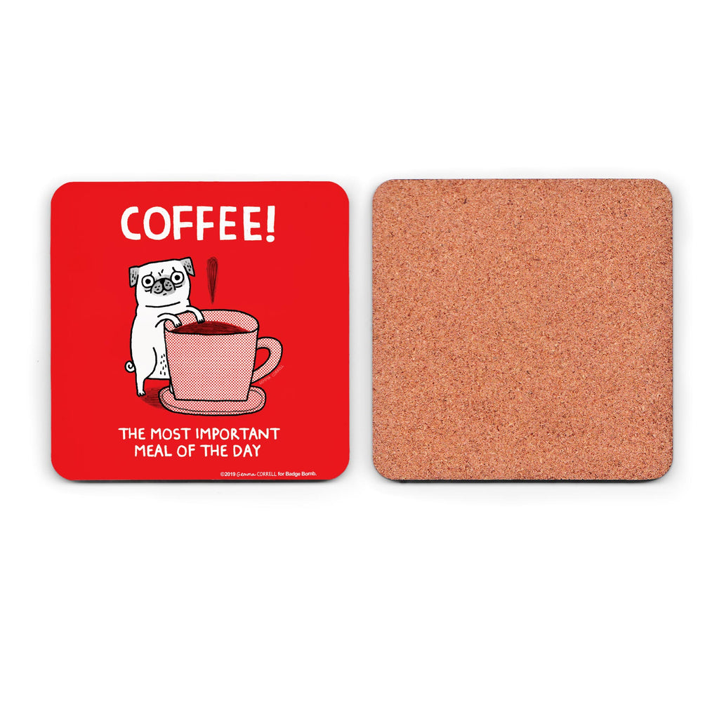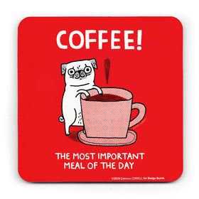 Coffee Pug Coaster by Gemma Correll. It's the most important meal of the day! High-quality cork-backed hardboard coasters to protect your surfaces in style.
