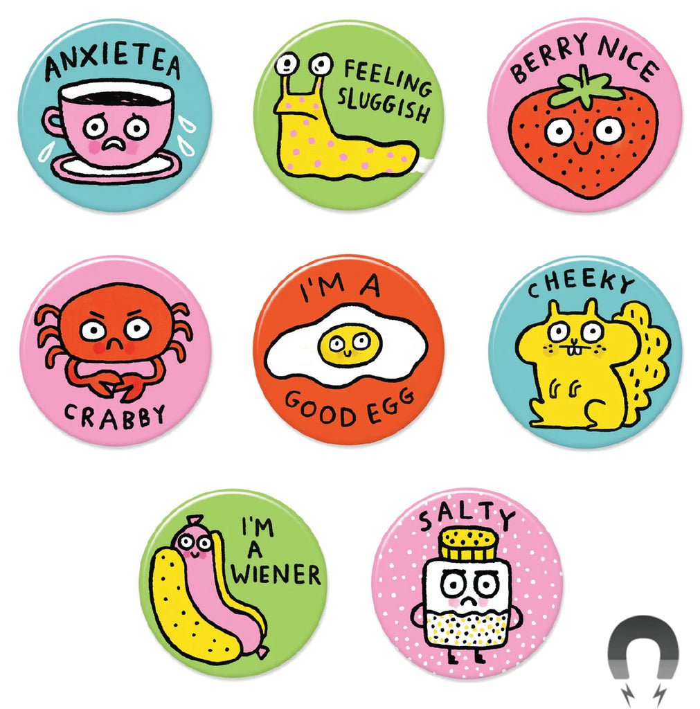 60 piece 2.25” magnet assortment of 8 puntastic designs from Gemma Correll. Proudly made in the USA by Badge Bomb.