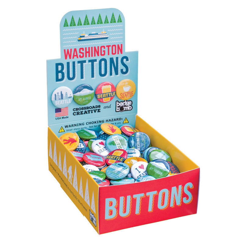 Washington Button Box, proudly designed and manufactured in the Pacific Northwest. USA made by Badge Bomb.