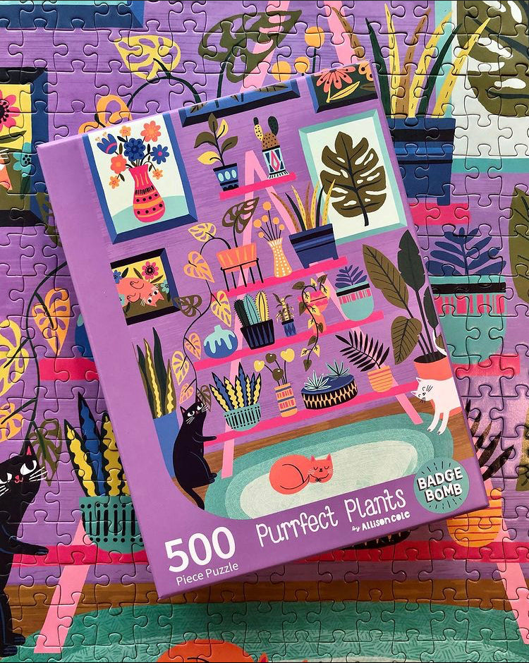 Allison Cole is a Rhode Island-based illustrator and artist with an expansive catalog of thoughtful, witty designs. This puzzle is inspired by her many passions, including house plants, cozy spaces, and depending on how you feel about it, an alarming number of cats.
